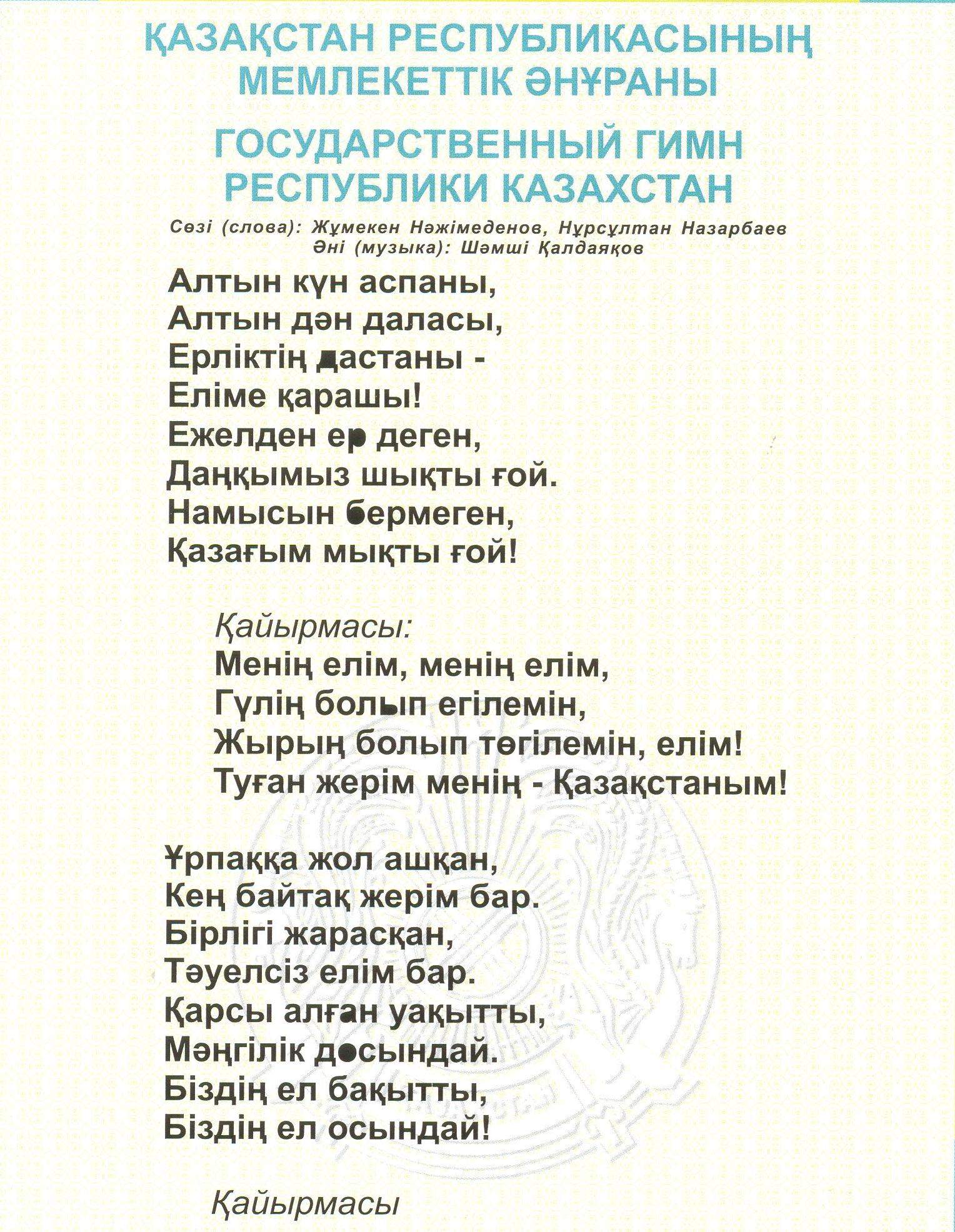 Бұрын «Менің Қазақстаным» әні ретінде танымал болған Қазақстанның әнұраны Президент Нұрсұлтан Назарбаевтың бастамасы бойынша 2006 жылы 6 қаңтарда еліміздің Парламентінде бекітілді. Бірінші рет ол 2006 жылы 11 қаңтарда Мемлекет басшысының салтанатты ұлықтау рәсімінде орындалды.Музыкасы – композитор Шәмші Қалдаяқовтікі, сөзі – Жұмекен Нәжімеденов пен Нұрсұлтан Назарбаевтікі.Әнұран – мемлекеттің басты рәміздерінің бірі.